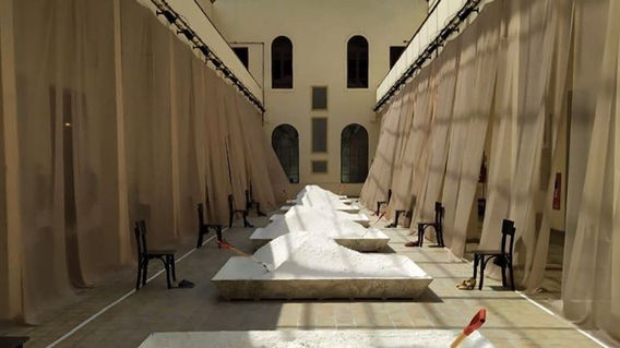 Em uma instalação sonora em iídiche escutamos as inscrições das lápides das 48 “polacas” sepultadas no Cemitério Israelita de Cubatão, com nome, local e data de nascimento, local e data de falecimento e mensagens de familiares e amigos. Assim imergimos nessa língua que foi tentativamente dizimada pelo nazismo e que era em boa parte a língua dessas mulheres marcadas pelo estigma dos preconceitos. Sete caixas de masseira de obra cheias de cal e com pás, ladeadas de cadeiras e pares de sapato femininos remetem tanto a esses corpos que não tiveram direito à dignidade, em vida e depois da morte, como ao esquecimento dessas histórias no feminino, que deveriam compor parte de nossa memória coletiva.